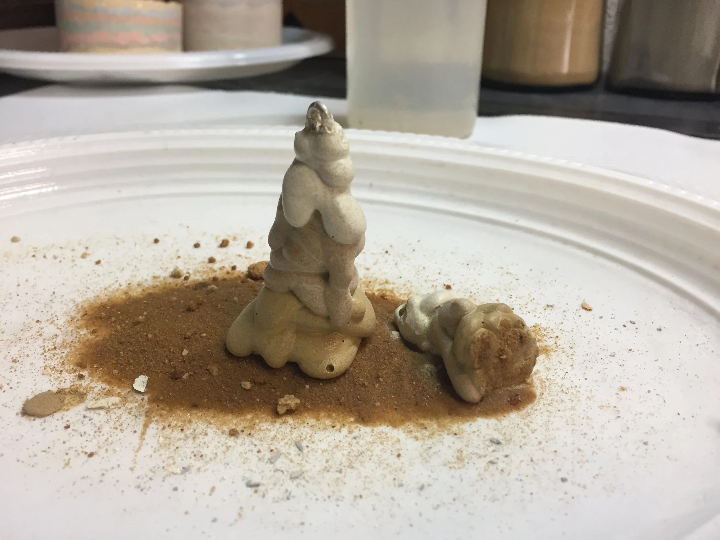 Following the concrete recipe that Vered shared in the last post, we’re chatting about how she made this necklace. She was showing me her works and I couldn’t for the life of me, figure out how she did it. And she kept saying “it’s like how you let wet sand slip out of your hand when you’re at the beach”. And I still couldn’t figure it out. That is, until she demonstrated it.